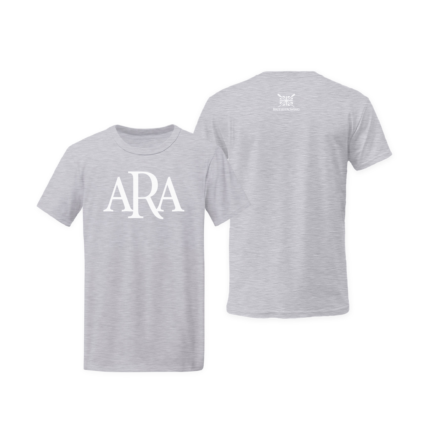 Classic Brit ARA Grey T-Shirt – Centre Front / Neck – White Logo