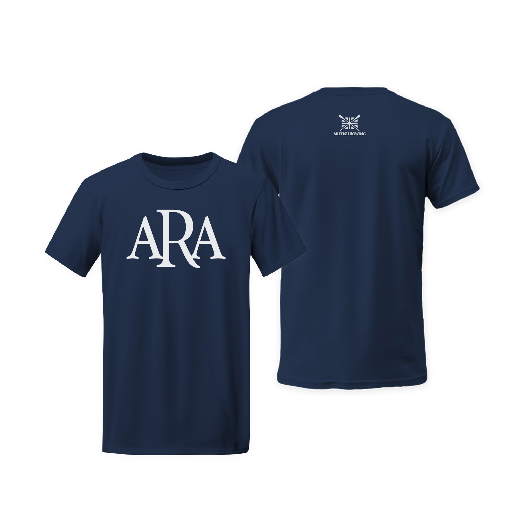 Classic Brit ARA Navy T-Shirt – Centre Front / Neck – White Logo